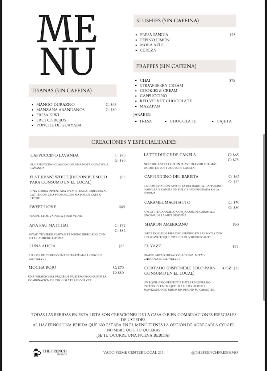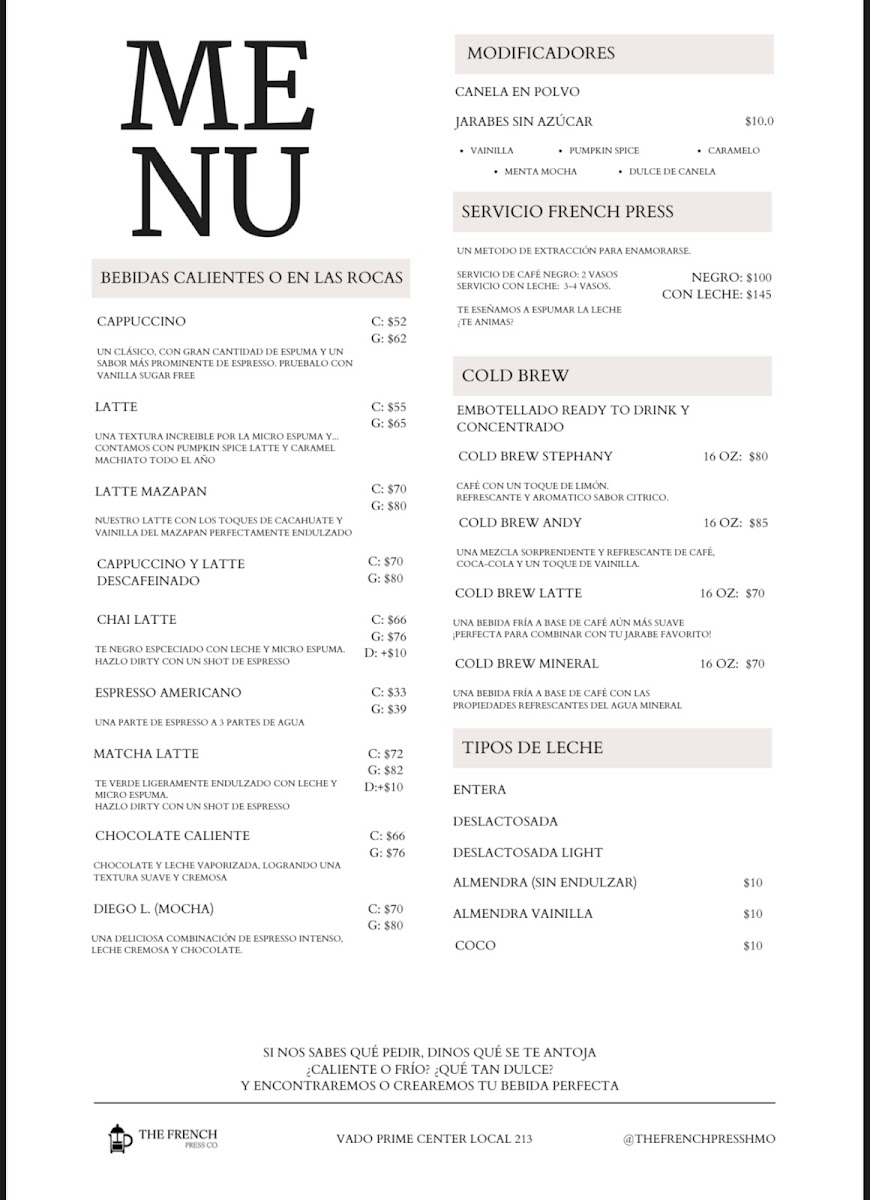 Welcome to The French Press Co., a delightful café nestled in Hermosillo, where the art of coffee meets innovative flavors. This charming establishment entices visitors with an array of unique beverages, such as the intriguing coffee with cola and fragrant lavender-infused brews. Customers rave about the expertly crafted lattes, with many considering them the best in the city.
